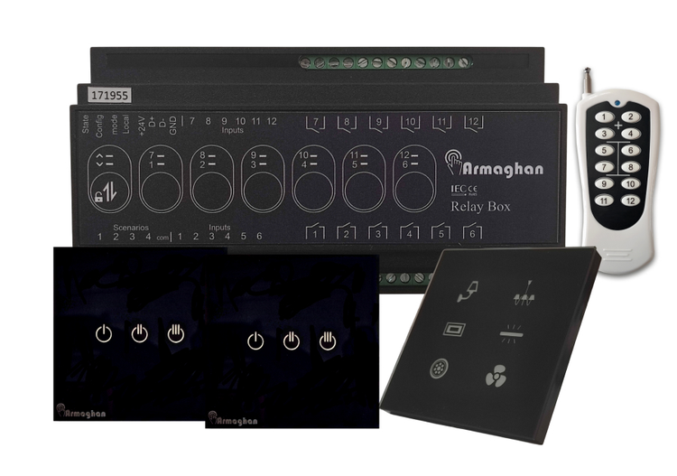 رله باکس این پکیج دارای ۱۲ ورودی است که به کلیدهای Pro Bus ارمغان متصل میشود و خروجی ها به لامپ و یا وسایل الکتریکی وصل میشود و شما امکان کنترل این ۱۲ سرخط روشنایی را با گوشی(از هر جای دنیا) و ریموت کنترل نیز دارید. با توجه به سیم کشی سری Bus محصولات، شما میتوانید در سیستم KNX یی خود نیز بدون هیچ تغییری در نحوه سیم کشی، از محصولات این پکیج استفاده کنید. (قابل استفاده از کابل CAT 6)