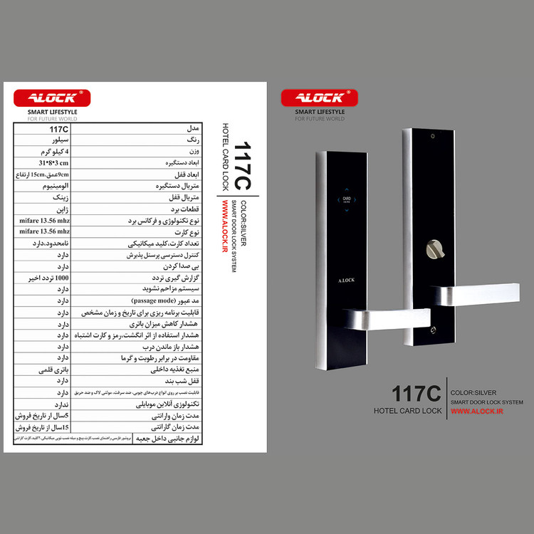 دستگیره هتلی ALOCK مدل 117C در گروه هتلی ها جزو پر فروش ترین ها می باشد . این دستگیره با قطعات ساخت ژاپن تولید شده است . بدنه محصول دارای مادا مالعمر گارانتی رنگ می باشد . تکنولوژی برد این محصول از نوع مایفر Mifare 13.56 Mhz می باشد . بدنه این دستگیره از جنس آلومینیوم ساخته شده است. بدنه بسیار مستحکم و با متریال فلزی مناسب و نوع دایکست به کار رفته در ساخت این محصول ، سبب افزایش قدرت و استحکام آن در بازه زمانی طولانی شده است. در این محصول قادر خواهید بود برای میهمانان کارت ها را بر اساس تعداد روز و ساعت رزرو شده تعریف نمائید . حتی میتوانید برای خانه دارها و روم سرویس ها و کافی من ها نیز بازه های زمانی و براساس طبقات و شیفت بندی شغلی تعریف نمائید . قابلیت ست شدن با پاورسوئیچ های تخصصی ALOCK و نیز کنترلر های هوشمند آسانسور از دیگر امکانات این محصول می باشد .