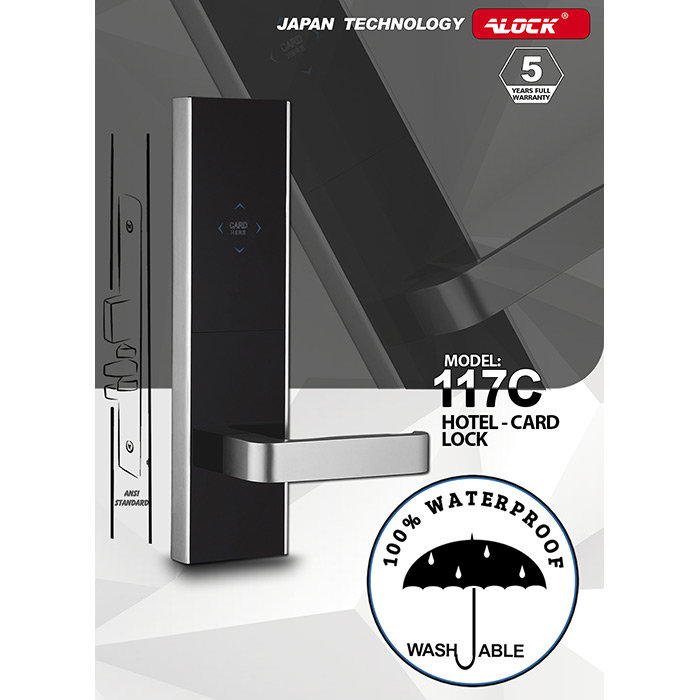 دستگیره هتلی ALOCK مدل 117C در گروه هتلی ها جزو پر فروش ترین ها می باشد . این دستگیره با قطعات ساخت ژاپن تولید شده است . بدنه محصول دارای مادا مالعمر گارانتی رنگ می باشد . تکنولوژی برد این محصول از نوع مایفر Mifare 13.56 Mhz می باشد . بدنه این دستگیره از جنس آلومینیوم ساخته شده است. بدنه بسیار مستحکم و با متریال فلزی مناسب و نوع دایکست به کار رفته در ساخت این محصول ، سبب افزایش قدرت و استحکام آن در بازه زمانی طولانی شده است. در این محصول قادر خواهید بود برای میهمانان کارت ها را بر اساس تعداد روز و ساعت رزرو شده تعریف نمائید . حتی میتوانید برای خانه دارها و روم سرویس ها و کافی من ها نیز بازه های زمانی و براساس طبقات و شیفت بندی شغلی تعریف نمائید . قابلیت ست شدن با پاورسوئیچ های تخصصی ALOCK و نیز کنترلر های هوشمند آسانسور از دیگر امکانات این محصول می باشد .