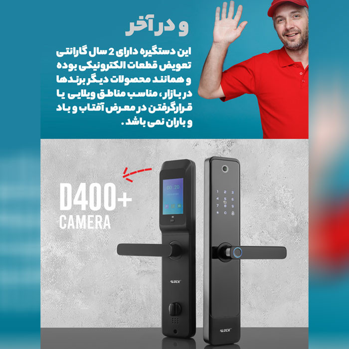 دستگیره اثرانگشتی دوربین دار D400+ Camera جزو محصولات اکونومی جدید شرکت ALOCK می باشد . این محصول دارای قابلیت تعریف 100 نفر اثرانگشت ،200 نفر رمز و کارت می باشد . دوربین این دستگیره 4 مگاپیکسل رنگی بوده که در صورت لمس کردن کلید زنگ ، علاوه بر ضبط تصویر بر روی مموری کارت تعبیه شده بر روی آن ، میتوان از داخل نیز بیرون را مشاهده کرد . و نیز تصاویر برای مدیر بصورت آنلاین ارسال خواهد شد . علاوه بر آن این دستگیره دارای قابلیت اتصال به موبایل با اپلیکیشن Smart life و Usmart go بصورت wifi می باشد . اپلیکیشن در بازه های زمانی مختلف تولید با نسخه های مختلف عرضه میشوند . و برای پروژه ها قابلیت سفارشی سازی می باشد . این دستگیره دارای صفحه لمسی شیشه ای ضد خش و کلید زنگ لمسی با دسیبل 50 می باشد . با اپلیکیشن تعبیه شده بر روی این محصول میتوان برای افراد رمز های یک یا چندبار مصرف تعریف کرد . بر روی اپلیکیشن این دستگیره ، میتوان گزارش تردد ها را مشاهده کرد . دوربین رنگی این دستگیره قابلیت دید در شب را دارد . یکی دیگر از قابلیت های این دستگیره قابلیت باز کردن با موبایل بصورت ریموتی می باشد . قفل شب بند تعبیه شده بر روی دستگیره سبب جلوگیری از ورود افراد از بیرون بدون دریافت اجازه و یا اتفاقی می باشد . دستگیره هوشمند D400+ Camera دارای منبع تغذیه باتری قلمی است . با 4 عدد باتری قلمی 1.5 ولت میتوان نزدیک به 6 ماه ازآن استفاده کرد . با سیستم هشدار کاهش میزان باتری از اتمام باتری آگاه خواهید شد . بر روی این دستگیره پورت شارژ اضطراری میکرو USB تعبیه شده تا در زمان اتمام باتری بتوان با یک پاوربانک یا شارژر موبایل منبع تغذیه را از بیرون منزل تامین کرد و پس از ورود رمز یا اثرانگشت ، وارد شد و باتری ها را تعویض کرد . کلید مکانیکی که بر روی این دستگیره تعبیه شده از نوع سوپر C می باشد که امنیت قابل قبولی را به کاربران میدهد . اهمیت وجود این کلید در مواقع اضطراری احساس خواهد شد. هنگامی که بخش الکترونیکی دستگیره به هر دلیلی از دسترس خارج شده باشد ، با این کلید مکانیکی میتوان درب را باز کرد و وارد شد .. یکی دیگر از قابلیت های دستگیره دیجیتال D400+ Camera شرکت ALOCK قابلیت تردد بدون نیاز به ورود رمز یا ... می باشد . به این حالت تردد آزاد یا Passage Mode گفته میشود . یعنی درب می تواند بصورت غیر فعال قرار بگیرد و کاربران بدون نیاز به وارد کردن رمز یا اثرانگشت فقط با پایین دادن دستگیره اقدام به تردد نمایند . این قابلیت برای میهمانی ها یا زمان هایی که در دفاتر زمان مراجعه ارباب رجوع زیاد می باشد به کار میرود . این دستگیره دارای 2 سال گارانتی تعویض قطعات الکترونیکی بوده و همانند محصولات دیگر برندها در بازار ، مناسب مناطق ویلایی یا قرارگرفتن در معرض آفتاب و باد و باران نمی باشد . ولی برای داخل ساختمان مناسب می باشد . این دستگیره قابلیت نصب بر روی انواع درب های چوبی و ضد سرقت و ضد حریق می باشد .