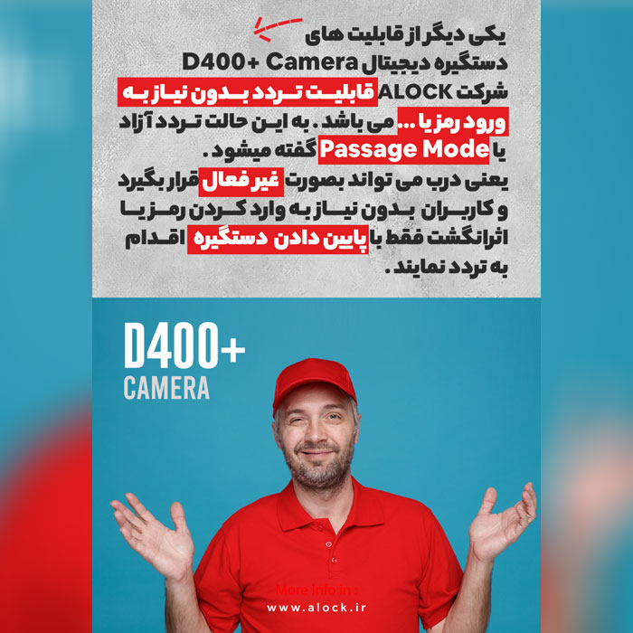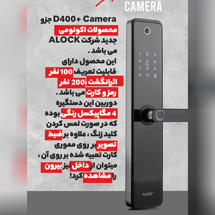 دستگیره اثرانگشتی دوربین دار D400+ Camera جزو محصولات اکونومی جدید شرکت ALOCK می باشد . این محصول دارای قابلیت تعریف 100 نفر اثرانگشت ،200 نفر رمز و کارت می باشد . دوربین این دستگیره 4 مگاپیکسل رنگی بوده که در صورت لمس کردن کلید زنگ ، علاوه بر ضبط تصویر بر روی مموری کارت تعبیه شده بر روی آن ، میتوان از داخل نیز بیرون را مشاهده کرد . و نیز تصاویر برای مدیر بصورت آنلاین ارسال خواهد شد . علاوه بر آن این دستگیره دارای قابلیت اتصال به موبایل با اپلیکیشن Smart life و Usmart go بصورت wifi می باشد . اپلیکیشن در بازه های زمانی مختلف تولید با نسخه های مختلف عرضه میشوند . و برای پروژه ها قابلیت سفارشی سازی می باشد . این دستگیره دارای صفحه لمسی شیشه ای ضد خش و کلید زنگ لمسی با دسیبل 50 می باشد . با اپلیکیشن تعبیه شده بر روی این محصول میتوان برای افراد رمز های یک یا چندبار مصرف تعریف کرد . بر روی اپلیکیشن این دستگیره ، میتوان گزارش تردد ها را مشاهده کرد . دوربین رنگی این دستگیره قابلیت دید در شب را دارد . یکی دیگر از قابلیت های این دستگیره قابلیت باز کردن با موبایل بصورت ریموتی می باشد . قفل شب بند تعبیه شده بر روی دستگیره سبب جلوگیری از ورود افراد از بیرون بدون دریافت اجازه و یا اتفاقی می باشد . دستگیره هوشمند D400+ Camera دارای منبع تغذیه باتری قلمی است . با 4 عدد باتری قلمی 1.5 ولت میتوان نزدیک به 6 ماه ازآن استفاده کرد . با سیستم هشدار کاهش میزان باتری از اتمام باتری آگاه خواهید شد . بر روی این دستگیره پورت شارژ اضطراری میکرو USB تعبیه شده تا در زمان اتمام باتری بتوان با یک پاوربانک یا شارژر موبایل منبع تغذیه را از بیرون منزل تامین کرد و پس از ورود رمز یا اثرانگشت ، وارد شد و باتری ها را تعویض کرد . کلید مکانیکی که بر روی این دستگیره تعبیه شده از نوع سوپر C می باشد که امنیت قابل قبولی را به کاربران میدهد . اهمیت وجود این کلید در مواقع اضطراری احساس خواهد شد. هنگامی که بخش الکترونیکی دستگیره به هر دلیلی از دسترس خارج شده باشد ، با این کلید مکانیکی میتوان درب را باز کرد و وارد شد .. یکی دیگر از قابلیت های دستگیره دیجیتال D400+ Camera شرکت ALOCK قابلیت تردد بدون نیاز به ورود رمز یا ... می باشد . به این حالت تردد آزاد یا Passage Mode گفته میشود . یعنی درب می تواند بصورت غیر فعال قرار بگیرد و کاربران بدون نیاز به وارد کردن رمز یا اثرانگشت فقط با پایین دادن دستگیره اقدام به تردد نمایند . این قابلیت برای میهمانی ها یا زمان هایی که در دفاتر زمان مراجعه ارباب رجوع زیاد می باشد به کار میرود . این دستگیره دارای 2 سال گارانتی تعویض قطعات الکترونیکی بوده و همانند محصولات دیگر برندها در بازار ، مناسب مناطق ویلایی یا قرارگرفتن در معرض آفتاب و باد و باران نمی باشد . ولی برای داخل ساختمان مناسب می باشد . این دستگیره قابلیت نصب بر روی انواع درب های چوبی و ضد سرقت و ضد حریق می باشد .