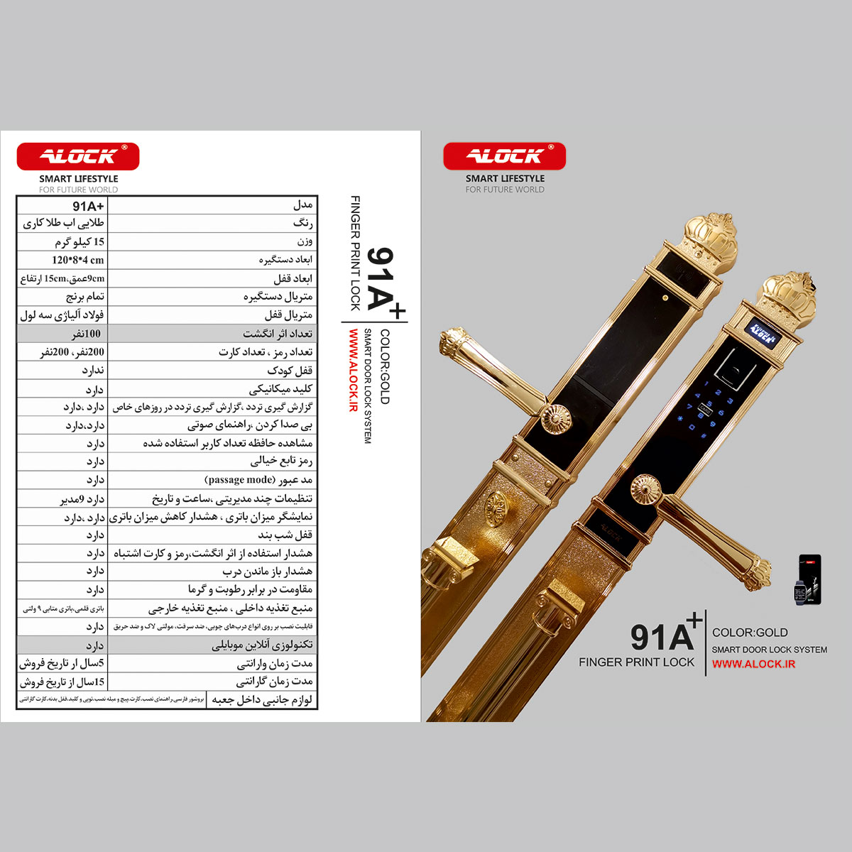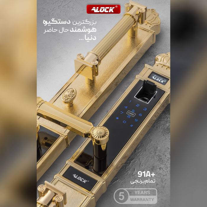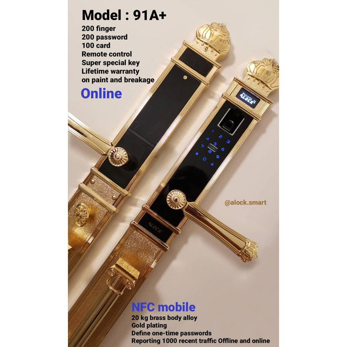 نیاز کشور و پروژه های مسکونی لاکچری و VIP در زمینه امنیت با جدیدترین تکنولوژیی های روز دنیا، سبب طراحی های خاص در صنعت قفل های الکترونیکی ALOCK شده است. قفل دیجیتال 91A+ یکی از زیباترین و اشرافی ترین قفل های دیجیتال حال حاضر دنیا می باشد. این قفل اثر انگشتی با داشتن ارتفاع 70 سانتیمتری و تماما برنجی با ویژگی های همچون صفحه لمسی شیشه حرارت دیده با تکنولوژی آنلاین و هوشمند، گارانتی مادام العمر رنگ و استقامت بدنه و تهیه شده از متریال برنج جزء گرانترین دستگیره های دیجیتال در جهان است. طراحی بلند و بی نظیر قفل هوشمند اثر انگشتی 91A+ با الهام از سرستون های تخت جمشید ایران و قابلیت ذخیره تعداد زیاد کاربران، کنترل و دسترسی به قفل در هر زمان و هر مکان از دنیا از طریق تلفن همراه، آن را به محصولی زیبا و فوق العاده تبدیل کرده است.