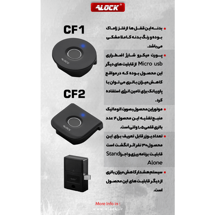 قفل کمدی هوشمند اثرانگشتی ALOCK مدل CF1 یک محصول خاص با کیفیت بسیار بالا می باشد . بدنه این قفل از فلز زاماک بوده و رنگ بدنه کاملا مشکی می باشد . بر خلاف تمامی برندهای موجود در بازار که از بدنه و پنل پلاستیک استفاده میکنند ، بدنه این قفل اثرانگشتی کابینتی از فلز می باشد . موتور این محصول بصورت اتوماتیک می باشد . . کاربرد این محصول برای درب های کمدی طلا و جواهر ، مدارک ، کلکسیون ساعت و ... اداری های پرسنلی می باشد . منبع تغذیه این محصول 3 عدد باتری قلمی 1.5 ولتی می باشد . پورت میکرو شارژ اضطراری Micro usb از قابلیت های دیگر این محصول بوده که در مواقع کاهش میزان باتری میتوان با پاوربانک برای تامین انرژی استفاده کرد . تعداد یوزر قابل تعریف برای این محصول 30 نفراثرانگشت می باشد . این قفل کمدی هوشمند نیازی به استفاده از نرم افزار نداشته و بصورت Stand Alone قابلیت برنامه ریزی و اجرا دارد . سیستم هشدار کاهش میزان باتری از دیگر قابلیت های این محصول می باشد